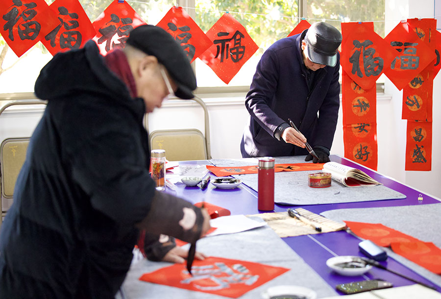 3、送祝?;顒印Q埳鐓^(qū)退休的書法達人為職工定制春聯(lián)和書畫作品?,F(xiàn)場翰墨飄香,書法家們揮毫潑墨,瞧,一幅幅春聯(lián)、一個個紅“福”成了職工搶手的文化年貨,不僅增添了濃濃的年味,而且也傳達了“娘家人”的暖心祝福。